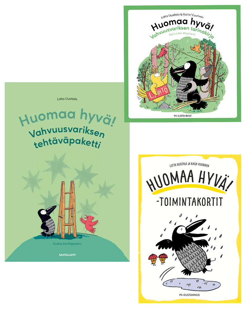 Huomaa hyvä! käytäntöön paketti: Huomaa hyvä! -toimintakortit, Huomaa hyvä! Vahvuusvariksen tarinakirja ja Huomaa hyvä! Vahvuusvariksen tehtäväpaketti