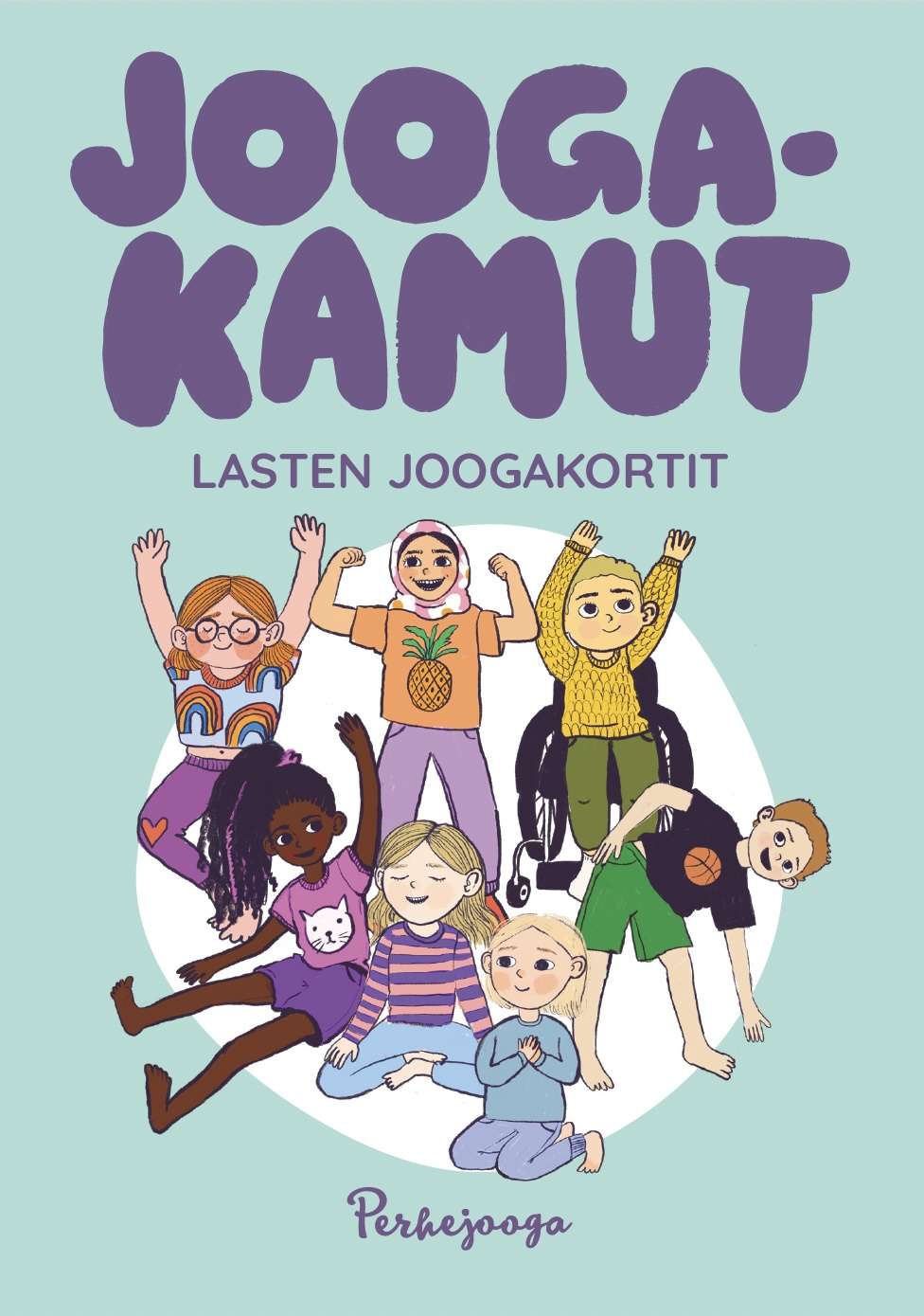 Lasten joogakorttipakka sisältää 50 harjoituskorttia ja 5 ohjekorttia. Jokaisessa harjoituskortissa on kuvitus ja kirjallinen ohjeistus. Harjoitukset on jaettu Perhejoogan lasten ja nuorten joogan viiteen kategoriaan: liike, hengitys, läsnäolo, lempeys ja rentoutus. Lisäksi korteista löytyy yhteisöllisyyttä vahvistavia joogaleikkejä ja valmiita joogahetkien suunnitelmia.