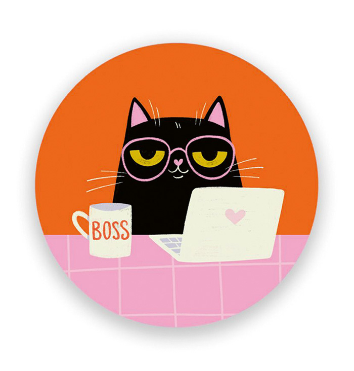 Laadukas ja hauska sisustusmagneetti jääkaapin oveen tai magneettiseen muistitauluun!Magneetin kuvassa musta Helvi-kissa läppärin äärellä, Boss-kahvikuppi vierellä. Tyylikäs mattapinta. Koko M, 56 mm. Design: Kaisu Sandberg.