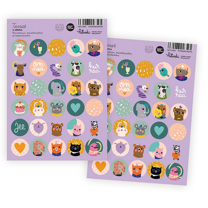 Pakkaus sisältää kaksi samanlaista A5 kokoista tarra-arkkia, joissa on erilaisia kuvia. Yhden tarran halkaisija 24 mm.Tarrat sopivat esimerkiksi bujoiluun, koristeluun ja askarteluun.Design: Mira Mallius.